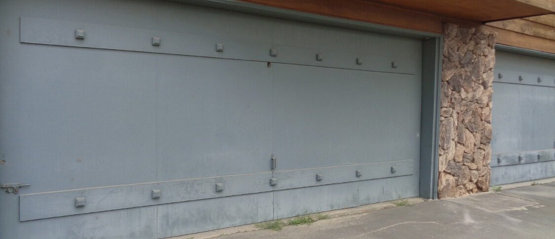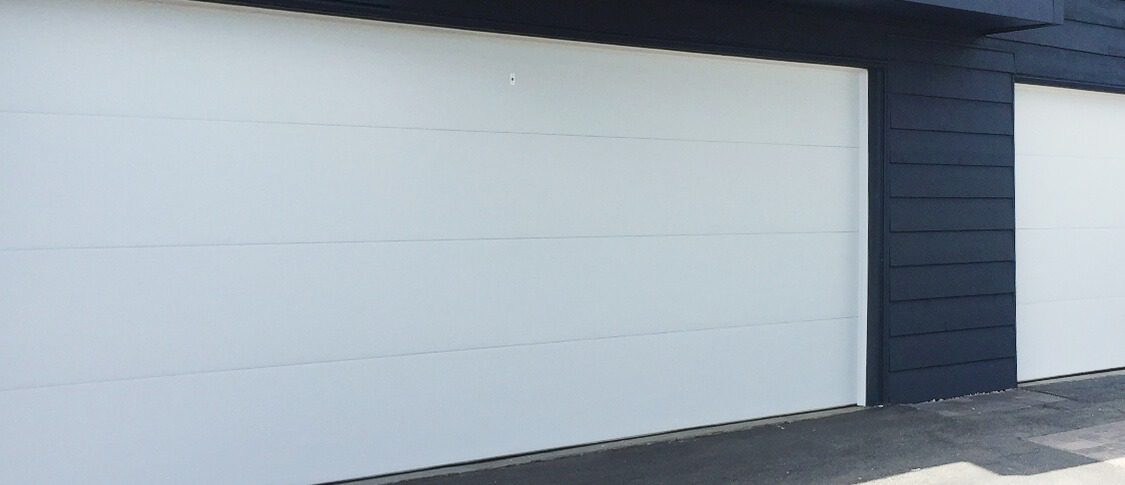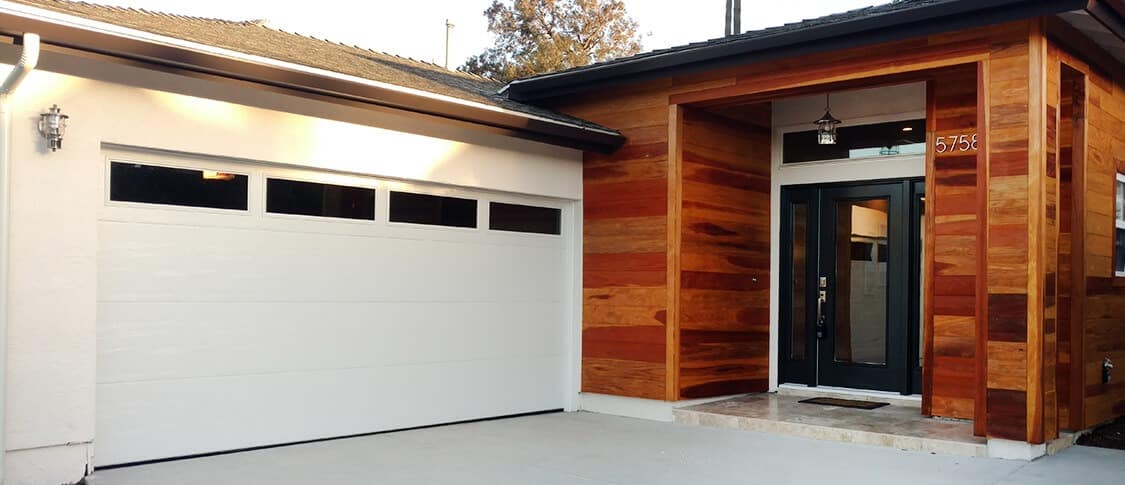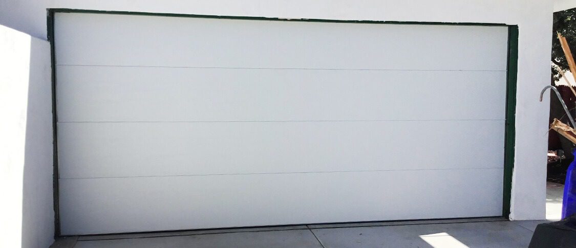 A new flush contemporary garage door was installed in place of an older wooden door with sharp vertical lines. The new garage door matches the fresh white paint of the exterior after an extensive home renovation.