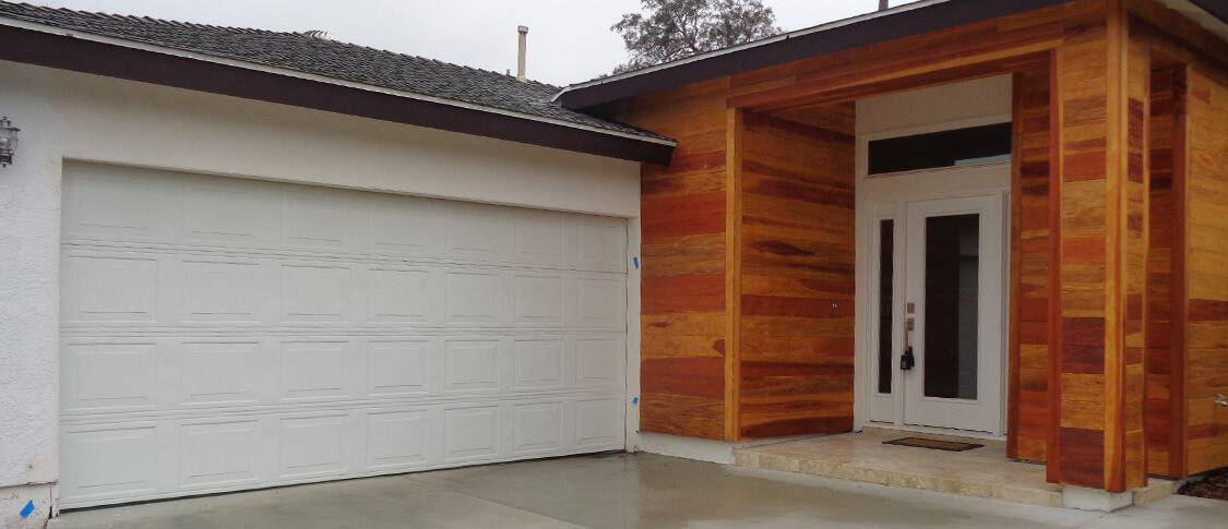 A new steel flush contemporary garage door was installed in place of a standard raised panel door. The flush steel door complements the contemporary horizontal wood siding on the face of the house and mimics the look of the window above the entry door.